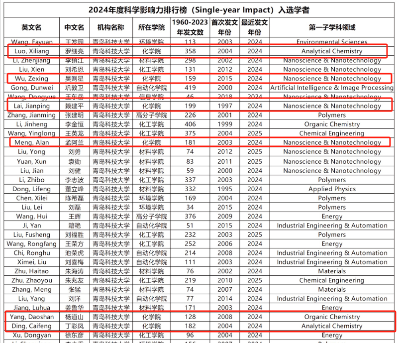 据悉,该榜单基于Scopus数据库的引用数据系统分析,通过多种综合指标(如被引数、H指数、HM因子等)评估科学家的“生涯影响力”和“年度影响力”,从近700万名科学家中遴选出世界排名前2%的科学家,分为22个领域和174个细分子领域。终身科学影响力榜单关注整个学术生涯迄今的影响力年度科学影响力榜单聚焦本年度学术成就。此外,该榜单还提供了面向科学家长期科研表现的衡量指标,客观真实反映科学家的学术影响力。(通讯员:陶亚亚、张高鹏)