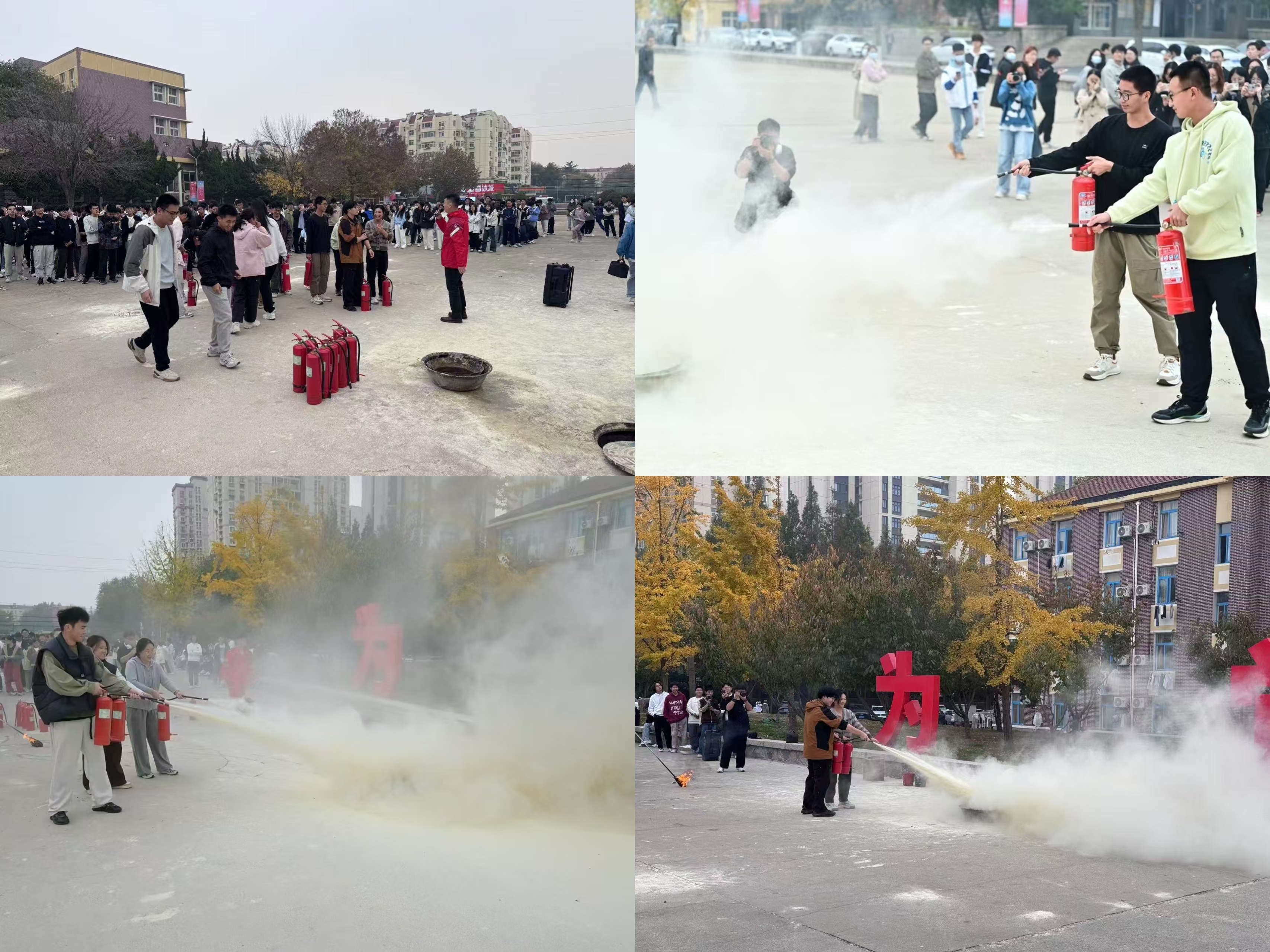 到达集合点后,各班班长清点人数并上报。随后,在小五四广场,保卫处消防科仇老师讲解消防安全知识,着重强调了增强消防安全意识、掌握消防安全防范知识和突发情况下应急处置措施的重要性和必要性。消防科讲解结束后,消防科仇老师演示并指导灭火器使用,同学们快速规范地完成灭火操作。