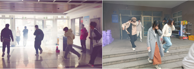 此次演练分为应急疏散和灭火演练两部分。演练信号发出后,员工们迅速按预定方案行动,在各楼层辅导员和志愿者引导下,按照预定方案沿着疏散通道前往小五四广场。疏散中,同学们保持低姿、捂住口鼻,动作规范、安静有序,展现出良好应急反应能力。