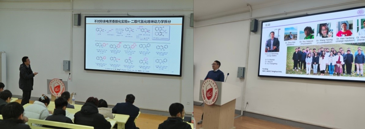 几位老师分别做了题为《Asymmetric Catalysis with Frustrated Lewis Pairs》、《芳胺不对称芳香亲电反应构建多样化分子手性》、《物理有机氟化学研究进展》及《仿生伯胺催化反应机制与人工智能建模》的学术报告,从不同角度、不同理念阐述了不对称合成及反应机制研究的背景及意义,并介绍了各自课题组近年来的工作进展,内容丰富且具有重要的学习价值,报告会在热烈的氛围及掌声中落下帷幕。报告结束后几位专家和现场的老师、同学们进行了多方面的交流与讨论。(通讯员 宋然)