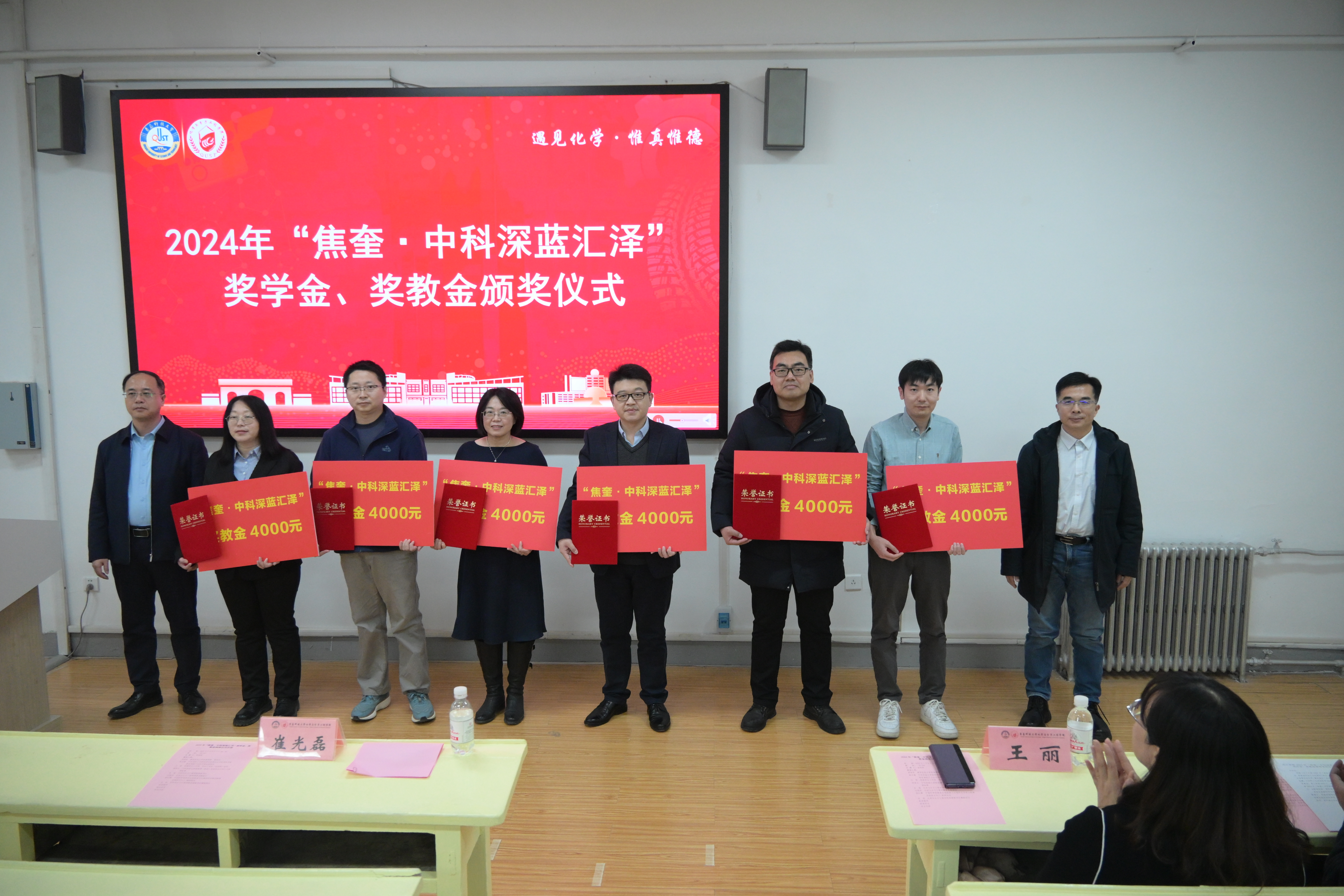 罗细亮和崔光磊共同为获奖老师颁发了证书和奖教金。