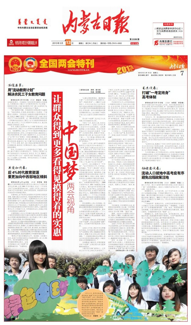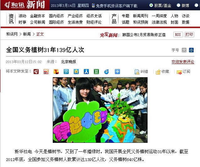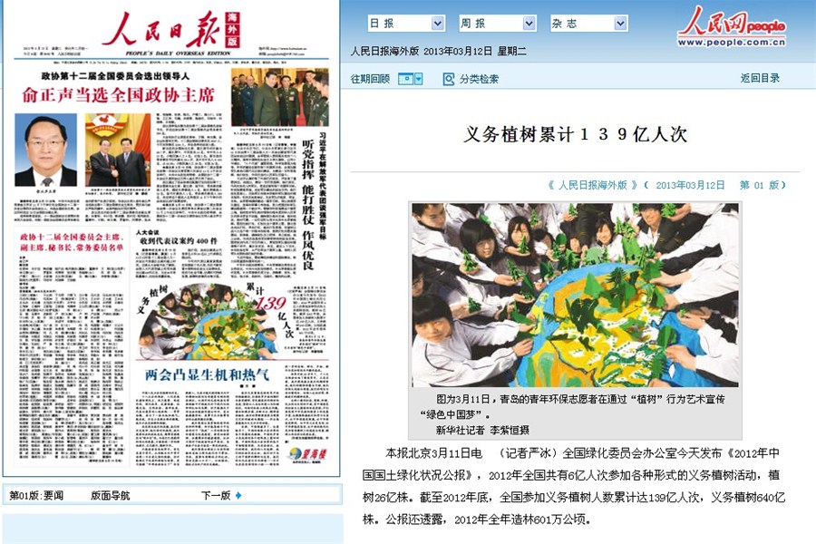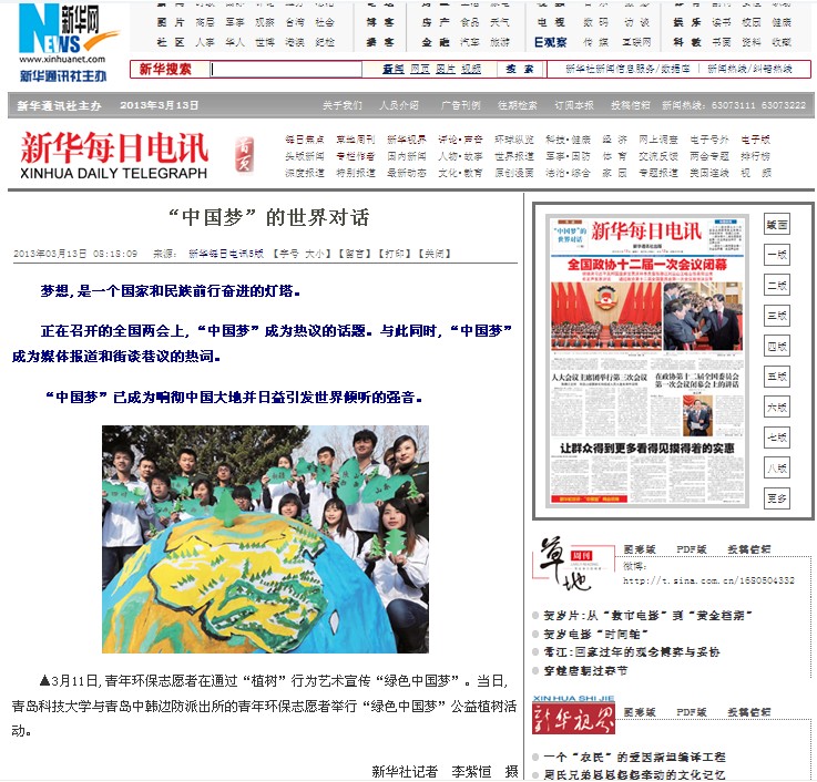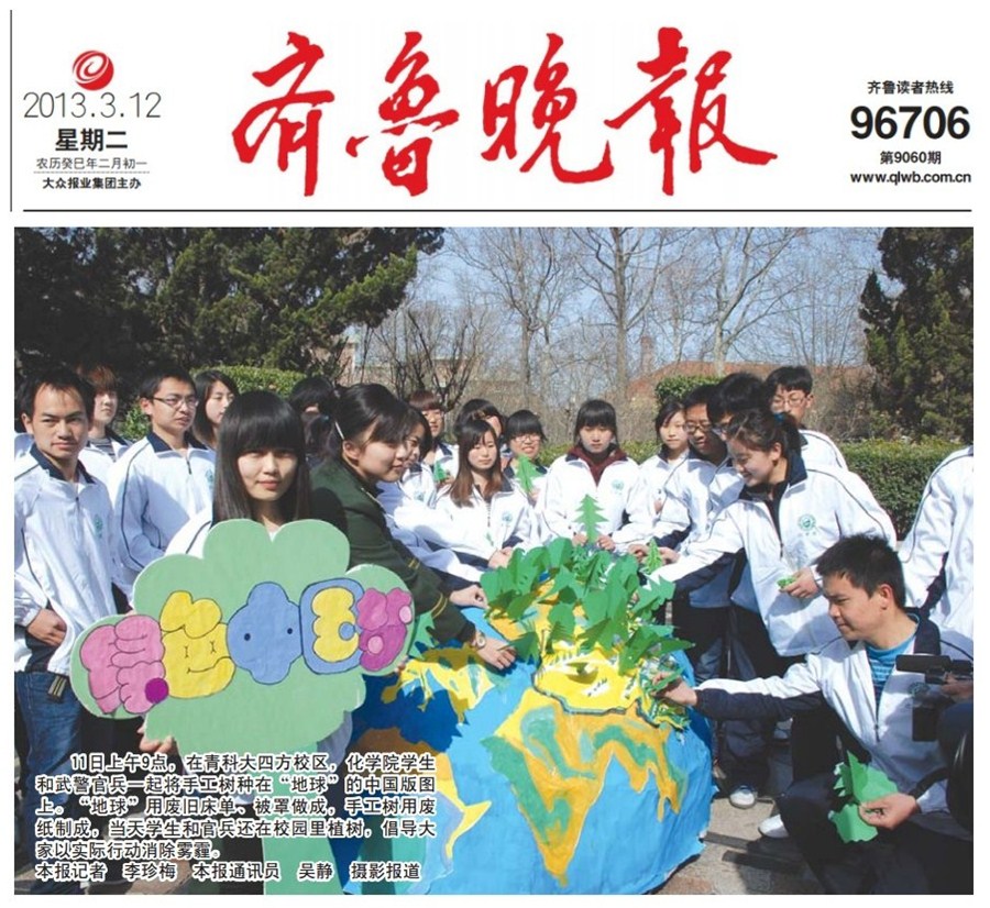 BB贝博艾弗森员工和边防派出所警官用废旧的床单、被罩,手工做成圆形的地球,地球上突出了中国的版图,从不同省份的老员工和武警中遴选出来自全国各地的代表,共同制作手工树,并将“绿树”种植在自己的家乡版图上。手工树的地球被老员工和边防武警包围在中间,寓意在当前“中国梦”的大背景下,来自全国各地的老员工和边防武警代表,带着自己的梦想,立志在自己的家乡所在地,力所能及的植树造林,强化地球之肺,为祖国的绿色大好河山,贡献微薄之力。活动进行过程中,新华社记者李紫恒给予了积极评价,并用手中的相机记录了活动的整个过程,此外齐鲁晚报、半岛都市报、崂山区电视台现场报道了本次活动,海科112班范玲芳在接受采访中说道:老员工与边防武警还通过互联网向全国传递环保电子贺卡、发布植树海报,呼吁全社会参与植树,倡议大家以实际行动为消除“雾霾”、增进绿色环保而努力。1、《新华每日电讯》:中国梦的世界对话