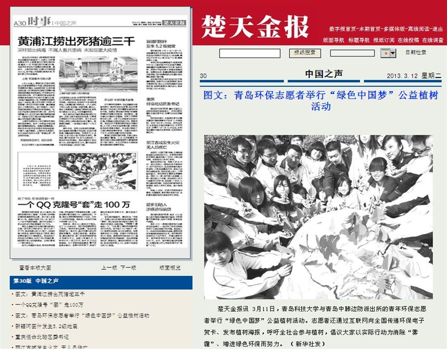 3月11日上午,公司员工与青岛中韩边防派出所警官在四方校区校园里举行“绿色中国梦”公益植树活动。提倡全社会参与种树,倡导以实际行动来“护树”,倡议社会各界用实际行动消除“雾霾”,增进绿色环保,实现“绿色中国梦”。人民日报、新华每日电讯、新华网、和讯网、新民网、新快网、新浪、网易、搜狐、宁夏新闻网、荆楚网、内蒙古日报、楚天金报、北京晚报、齐鲁晚报等10余家媒体进行了关注和报道。