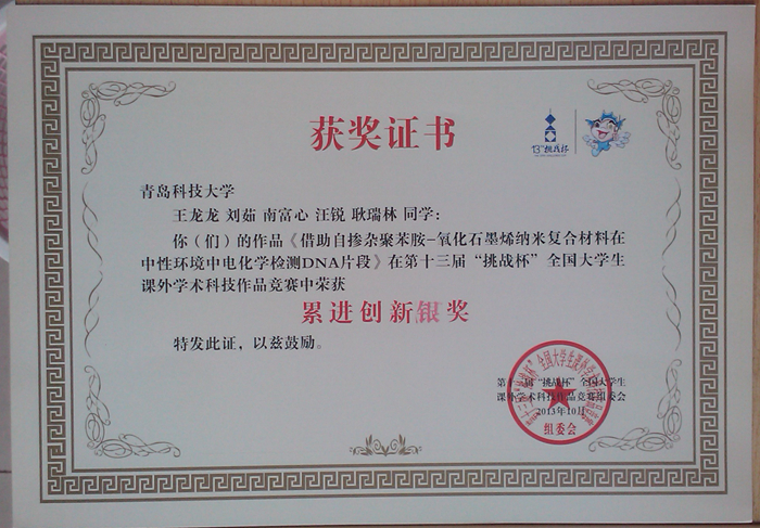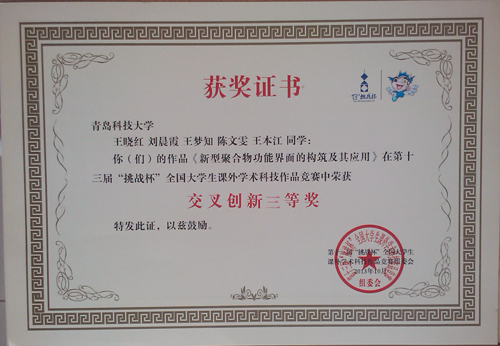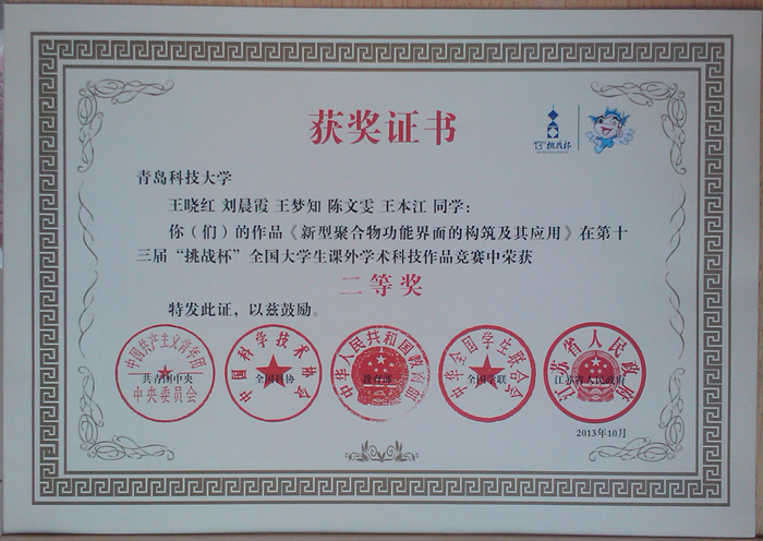 近日,由共青团中央、中国科协、教育部、全国学联、江苏省人民政府共同主办,苏州大学、苏州工业园区承办的第十三届挑战杯“交通银行”全国老员工课外学术科技作品竞赛在苏州大学闭幕。公司杨涛、焦奎指导的,王晓红、刘晨霞、王梦知、陈文雯、王本江同学的《新型聚合物功能界面的构筑及其应用》荣获第十三届“挑战杯”全国老员工课外学术科技作品竞赛二等奖。同时,王龙龙、刘茹、南富心、汪锐、耿瑞林同学的《借助自掺杂聚苯胺-氧化石墨烯纳米复合材料在中性环境中电化学检测DNA片段》荣获第十三届“挑战杯”全国老员工课外学术科技作品竞赛累进创新银奖,王晓红、刘晨霞、王梦知、陈文雯、王本江同学的《新型聚合物功能界面的构筑及其应用》荣获第十三届“挑战杯”全国老员工课外学术科技作品竞赛交叉创新三等奖。