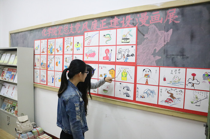 本次漫画展以“党风建设、廉政文化”为主题。配以“官僚主义、马失前蹄、伯乐的困惑、武松打虎”等风趣幽默的作品,贴近生活、寓意深刻。其中“反腐浪潮”以浪花拍向漫画中人物的形式向参观者形象的说明了国家公职人员不要心存侥幸、心怀贪欲,要常存敬畏之心,牢记宗旨、廉洁奉公,为群众谋利办实事。类似的作品皆以老师和同学们喜闻乐见的形式进行创作,廉政漫画篇幅短小,主题鲜明,让观看者忍俊不禁的同时又耐人寻味,从而将所要表现的主题思想牢牢地印在观看者的心里,起到了很好的教育引导作用。