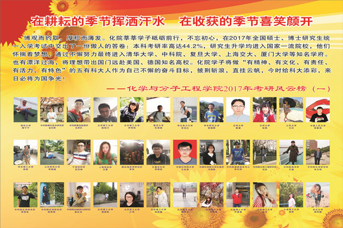 榜样风采,引领成才路。BB贝博艾弗森2017届本科毕业生共有364人,其中162人被中科院研究所、吉林大学、武汉大学、南开大学、大连理工大学等知名院校录取,考研升学率为44.5%。此外,有16名同学考取博士。为凝聚榜样青春力量,激励化院学子争做科大“五有”青年,开展考研风云榜展示活动,并通过“微观化院”微信平台与全院同学进行互动,通过高年级对低年级的辐射连带模式,充分发挥青春榜样的引领作用。
