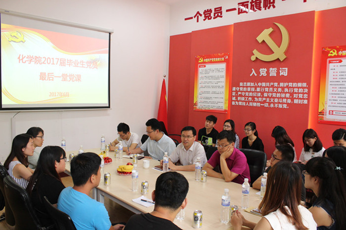上好最后一堂党课。公司在“五星党苑”党建活动室开展“毕业生党员最后一堂党课”主题教育活动。党总支书记王德宝给毕业生党员上离校前最后一次党课并寄语毕业生党员:“一个党员就是一面旗帜,祝福你们前程似锦,要常怀感恩之心,感恩父母、感恩老师,勇于担当一名当代优秀共产党员的责任和义务”。党总支副书记张壮勉励大家要志存高远,以自己实际行动在各自的岗位上彰显五有科大人的精气神。副经理胡志强希望各位党员,在新的环境中认真践行“两学一做”精髓,将在科大的积淀应用到实际生活中,勇攀高峰。