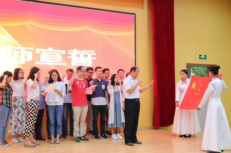 2017年新进教师在会场庄严宣誓,代表全体教职工向2017级新生做出郑重承诺:忠诚于党和人民的教育事业,恪尽职守,育人为本,追求卓越,勇于担当,为实现民族复兴、推动人类文明进步而奋斗!