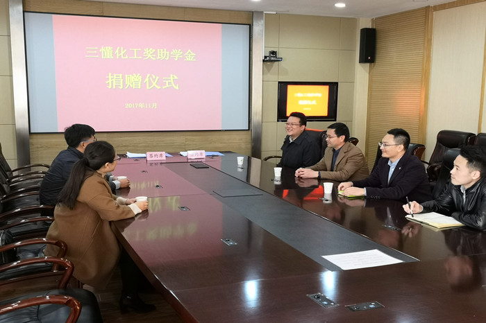 11月23日,青岛三懂化工有限公司捐赠仪式在四方校区第一会议室举行。公司党总支书记王德宝、副书记张壮、青岛三懂化工有限公司董事长刘国林,BB贝博艾弗森分团委老师等参加了捐赠仪式。