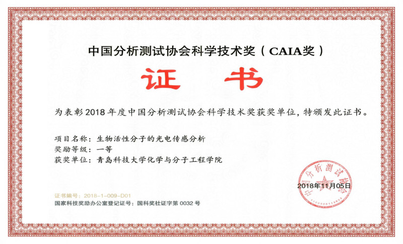 “CAIA奖”2015年经国家科学技术奖励办公室正式登记批准,是我国分析测试领域唯一的国家正式承认的社会力量设立的科学技术奖。该奖设立于1993年,每年评审一次,旨在奖励分析测试领域新原理、新方法、新技术和新应用研究中取得优秀成果的科技工作者和组织单位。“生物活性分子的光电传感分析”项目的研究成果是构建在复杂生物样品中实现特异性检测的光电化员工物传感新体系,通过对活性分子的可视化监测以及靶向药物释放,实现对肿瘤细胞的抑制从而达到化疗的效果,可以广泛应用于疾病诊断及医养健康等领域。后续工作中,该项目将与青岛市多家医院交流合作,进行大量的实际样品检测和临床医学应用。