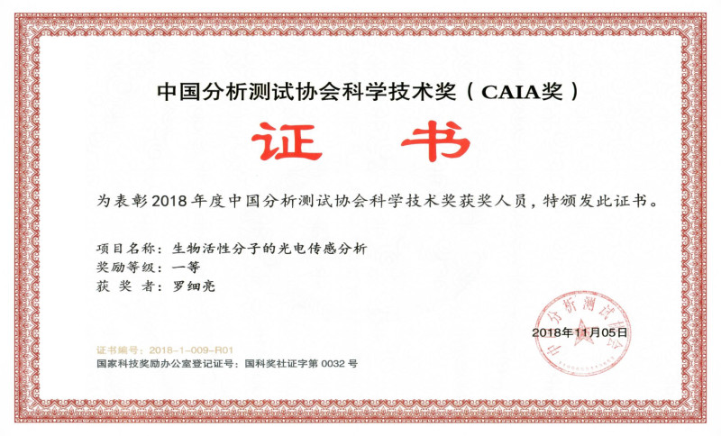 12月6日,中国分析测试协会第八届理事会第三次会议暨中国分析测试协会科学技术奖(简称“CAIA奖”)颁奖仪式在北京召开,会议隆重表彰了2018年度中国分析测试科学技术奖的获奖单位和个人。BB贝博艾弗森经理罗细亮等人主持申报的项目“生物活性分子的光电传感分析”荣获本年度 “CAIA奖”一等奖,是公司首次获得该领域的最高奖项。