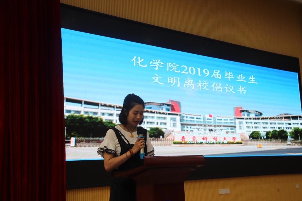 首先,刘施施为同学们介绍了如何应用离校系统办理离校相关手续,强调离校前的文明、安全行为,并鼓励毕业生爱校、荣校,以“还学弟学妹们一个洁净宿舍”等实际行为给母校、母院献礼。接下来,张雯以感谢同窗、感恩母校、感激父母等为切入点,给同学们上了感恩教育的生动一课。最后,毕业生焦龄莹代表全体毕业生宣读文明离校倡议书。