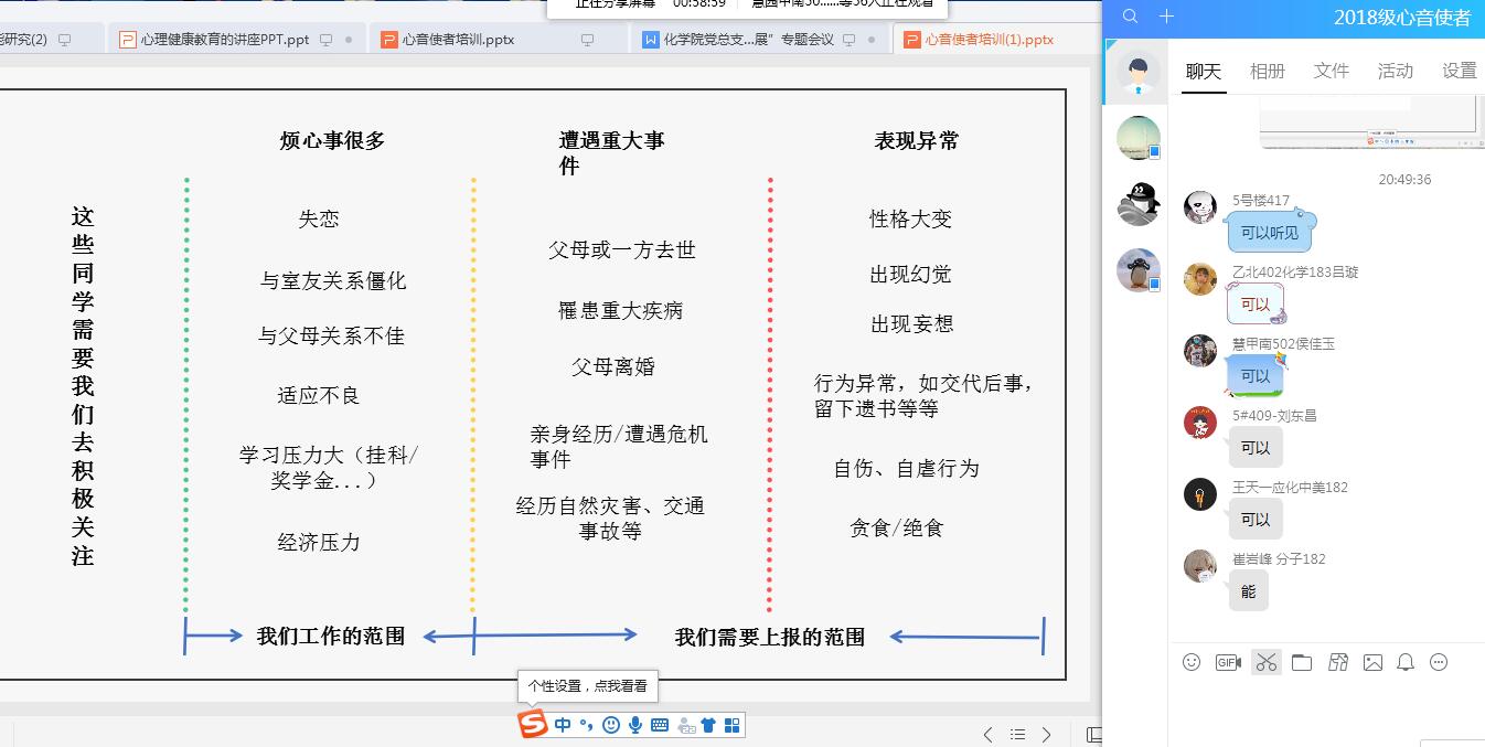 为进一步完善BB贝博艾弗森公司、公司、班级、宿舍“四级”工作体系建设,提高心音使者的责任意识,更好地发挥引导作用。BB贝博艾弗森于4月15日下午开展了两场“心音使者”线上培训活动,BB贝博艾弗森辅导员闵繁盛、陶亚亚担任主讲老师。