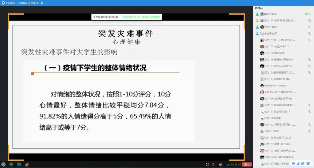 公司2016、2017、2018级共266名心音使者参加了本次培训,涵盖公司本科生大二-大四的每间宿舍。培训会上,陶亚亚向同学们详细介绍了BB贝博艾弗森心理危机四级预警防控体系实施细则,并结合现实情况,帮助同学们分析了新冠肺炎疫情对老员工的心理影响,在活动最后,她指出心音使者们要明确自己的使命,学会观察、学会倾听、学会助人。闵繁盛利用一个小时的时间与心音使者就疫情之后的心理创伤教育、居家学习心理状态教育、目前阶段的焦虑顾虑等方面进行交流,特别就心音使者的职责和工作方法开展讲解。