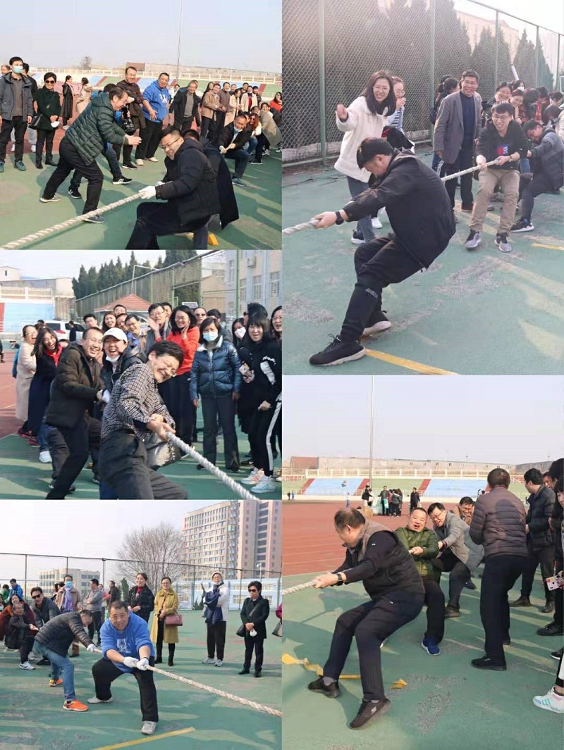 乍暖还寒的天气,三月明媚的春光。八支队伍抽签选定比赛对手,每队十名老师参赛。在裁判的哨声中,比赛正式开始。参赛老师手握麻绳,脚钉地面,用尽全身力量。绳索在决胜线左右摆动,胜负难分,比赛异常激烈。一旁的拉拉队老师们,用整齐、有节拍的呐喊声为参赛队员助威。经过激烈竞争,四支队伍胜出第一轮比赛,进入次轮比赛。
