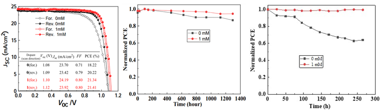 这种π-Pb2+之间的相互作用增强界面电位,因此掺杂能够导致钙钛矿的功函降低,促进空穴向空穴传输层中的转移效率。因此,修饰有机分子的器件实现了21.14 %的电池效率,而且有效的降低回滞效应(回滞效应为0.3 %,对比电池的回滞效应达到9.9 %)。修饰有机分子的器件正扫/反扫的效率分别为21.41 %和21.34 %;对比未修饰有机分子的器件正扫/反扫的效率分别为20.22 %和18.22 %。此外研究了器件的稳定性,暴露在相对湿度(RH)约20 %的空气中,掺杂的器件在存储1300小时后仍大约保留初始光电转换效率的94 %,而未掺杂的器件在相同条件下只保持了原光电转换效率的87%。持续光照下,掺杂的器件封装后260h性能没有衰减,而控制器件封装后持续 250h性能降为原来的60%,衰减明显。