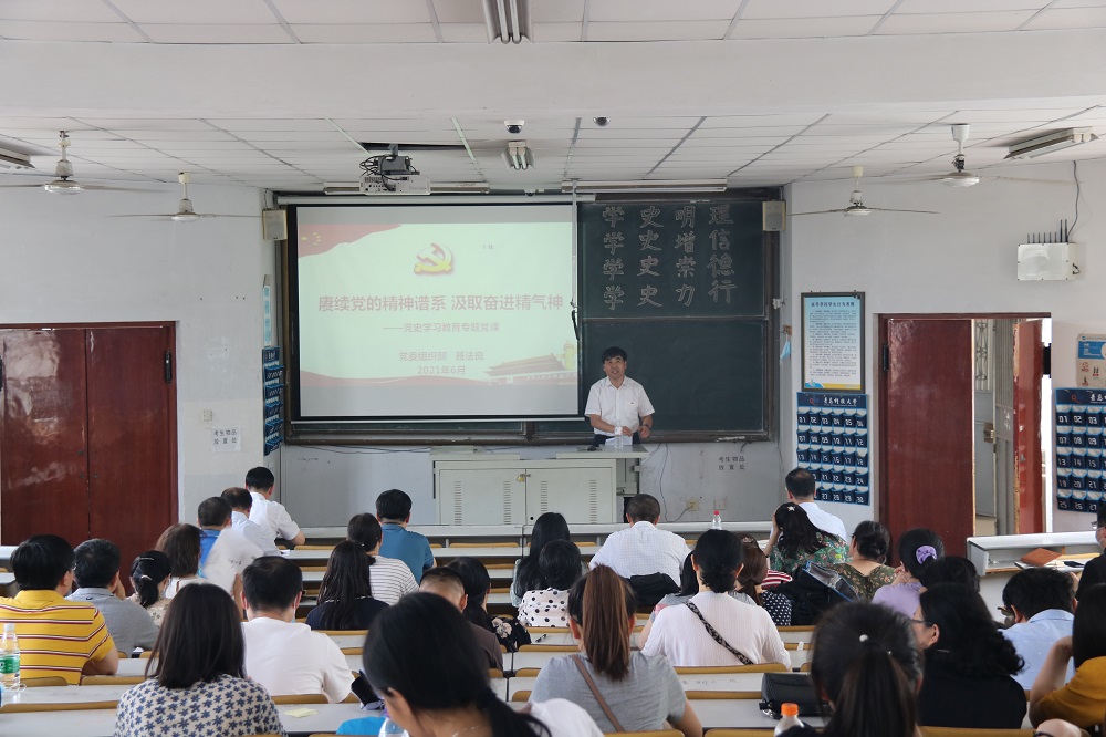 聂法良以“赓续党的精神谱系,汲取奋进精气神”为题,从精神世界、精神状态、中国共产党精神产生基础、中国共产党具体精神主体对中国共产党精神谱系展开多维分析,详细讲述了“认真学习党的精神谱系”、“深刻体会中国共产党人的精神谱系的核心理念”、“汲取奋进精神”三个方面的内容。他指出党史是最好的教科书,是最好的营养剂,广大教工党员要从党的精神谱系中汲取前进的力量,树立坚定的理想信念、根植强烈的家国情怀、弘扬不畏艰难的气概、培养勇于创新的精神、崇尚严于律己的品德,用党的光荣传统和优良作风凝聚力量、砥砺品格,增强“四个意识”、坚定“四个自信”、做到“两个维护”,焕发继往开来干事创业的壮志豪情,在“两个一百年”历史交汇的关键节点,以立德树人作为根本出发点和落脚点,引导当代老员工修好党史这门“必修课”,把党史学习教育融入课程体系,打造三全育人格局,彰显思政教育效果。