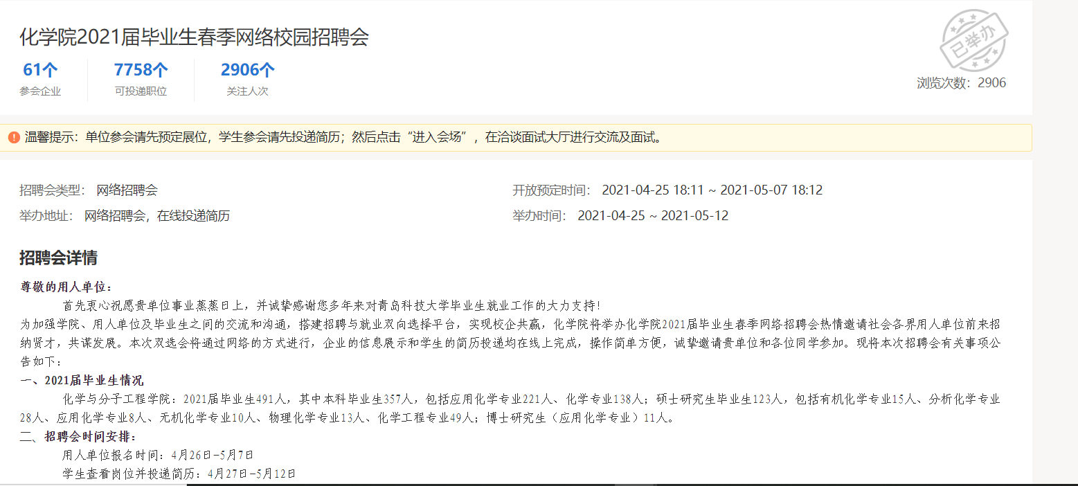 为了确保本次网络招聘会的成功举办,公司提前通过校园就业信息网发布双选会预告,广泛邀请用人单位参会,将通过审核的用人单位和毕业生信息提前输入系统,做到精准对接。本次招聘会共有65家企业参加为毕业生提供了7758个岗位,岗位与毕业生比例为16:1。