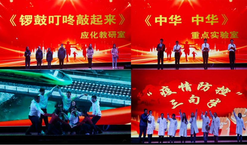 分团委的老师们和员工一起表演了舞蹈《再唱山歌给党听》欢乐的气氛充满了西礼堂。化学教研室与学科实验中心一起表演的歌伴舞《可可托海的牧羊人》,温永红老师一曲高歌把气氛推向了高潮。物化教研室的疫情防控三句半、基础化学原理教研室和中美教研室一起表演的诗朗诵《永远跟党走》让我们坚信在党的领导下,我们一定能打赢疫情防控战!最后晚会在有机化学教研室演唱的歌曲《没有共产党就没有新中国》中完美结束!