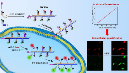miRNA参与了细胞增殖、分化和凋亡等重要的生理过程。异常的miRNA表达与某些疾病的发生和发展密切有关,如恶性肿瘤。因此,准确监测细胞内miRNA水平对基础生物学研究和疾病诊断具有重要意义。目前发展的RT-PCR、Northern印迹和微阵列筛选等方法虽然已在细胞裂解液实现了miRNA的检测,但无法适用于活细胞中的原位检测。荧光成像技术具有原位成像、可视化、分辨率高和无创性等优势。然而,传统的荧光传感体系受到信号输出不稳定、探针递送效率低等影响,鲜少能够实现的细胞内定量。