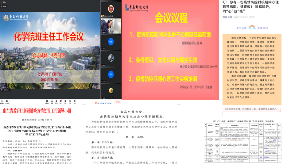 组织学习《山东省教育厅新冠肺炎疫情处置工作领导小组关于做好当前疫情形势下员工心理健康教育工作的通知》和《BB贝博艾弗森疫情防控期间老员工应急心理干说预预案》,组织公司班主任、团学骨干、心理委员等开展线上心理疏导业务培训,在公司“微观化院”公众号发布《同“心”战“疫”,排解疏导,——做好疫情防控封校期间的心理疏导》推文,制定公司“3·25善爱我”活动规划。