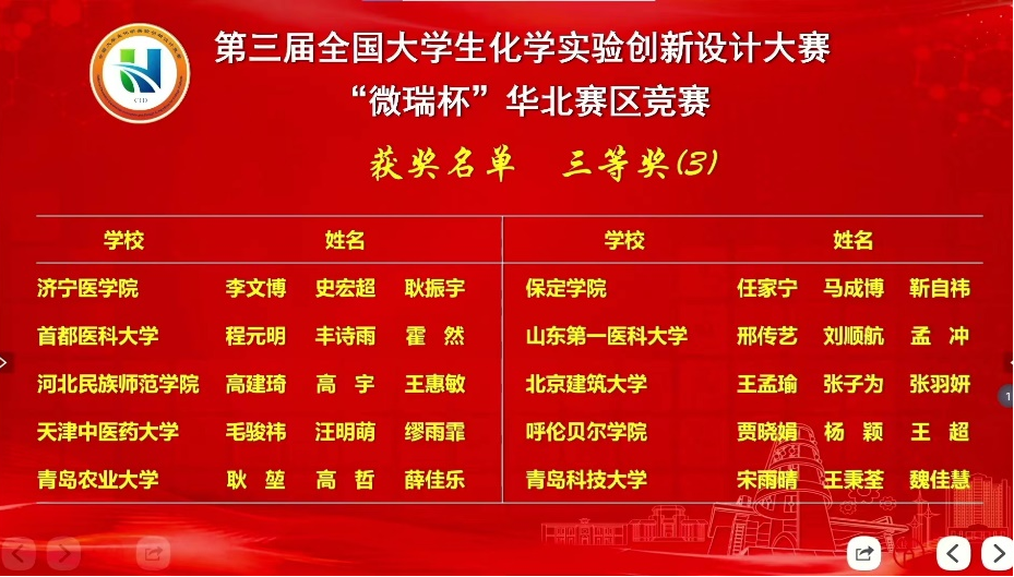 7月14日-17日,第三届“微瑞杯”华北赛区竞赛在北京师范大学举行。BB贝博艾弗森本科生公跃程、左峻泽和宋福想的《香豆素-3-羧酸的绿色合成及其结构表征》改进实验作品,获得华北赛区一等奖,并成功晋级全国总决赛。指导教师为基础化学实验中心的王书文和王静老师。