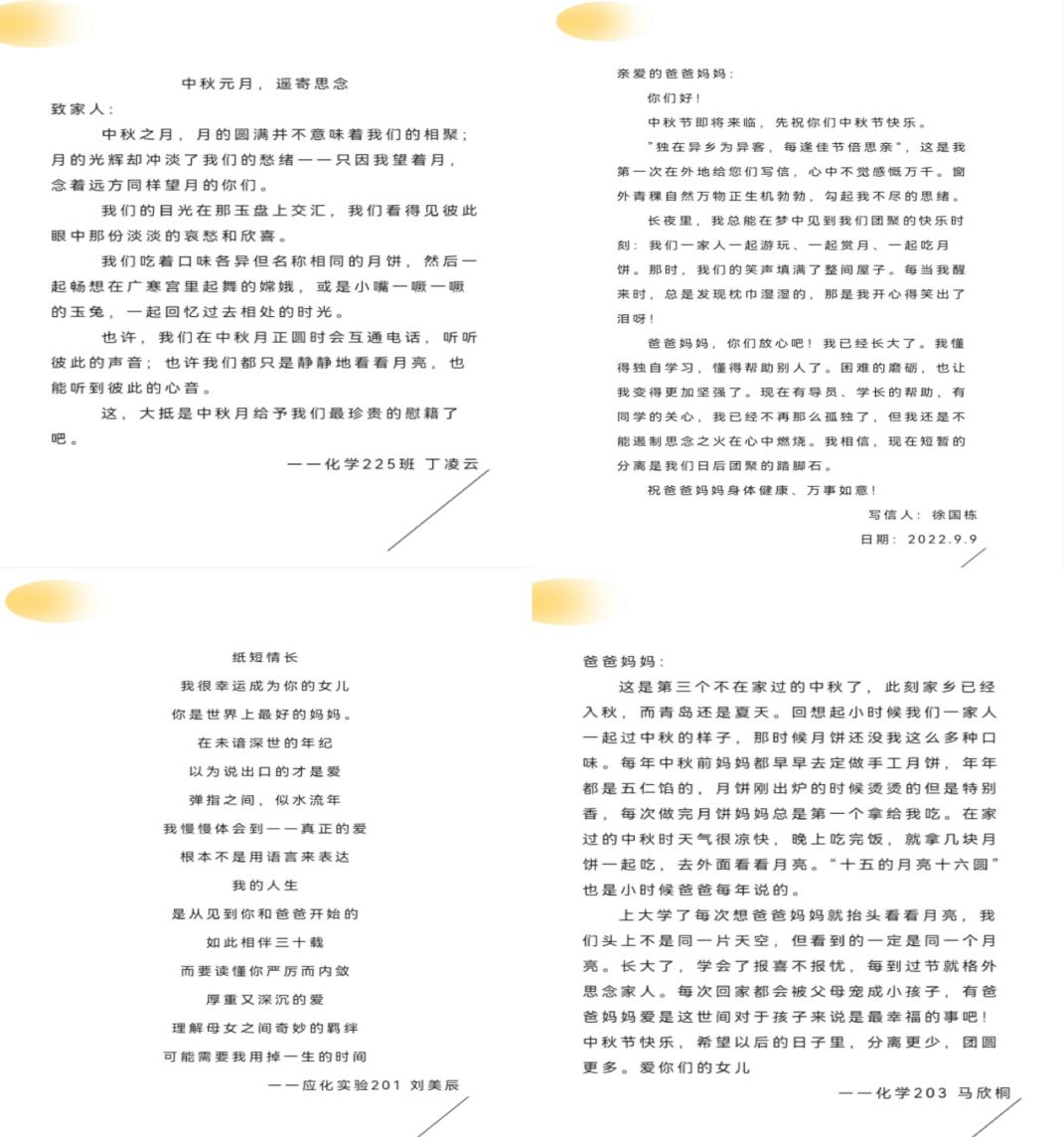 手写家书暖心。中秋节前夕公司组织“一封家书寄相思”活动,中秋节当天公司“微观化院”公众号收到了许多新生投稿,内容情真意切,体现了同学们浓浓的思乡之情与对家人满满的爱。
