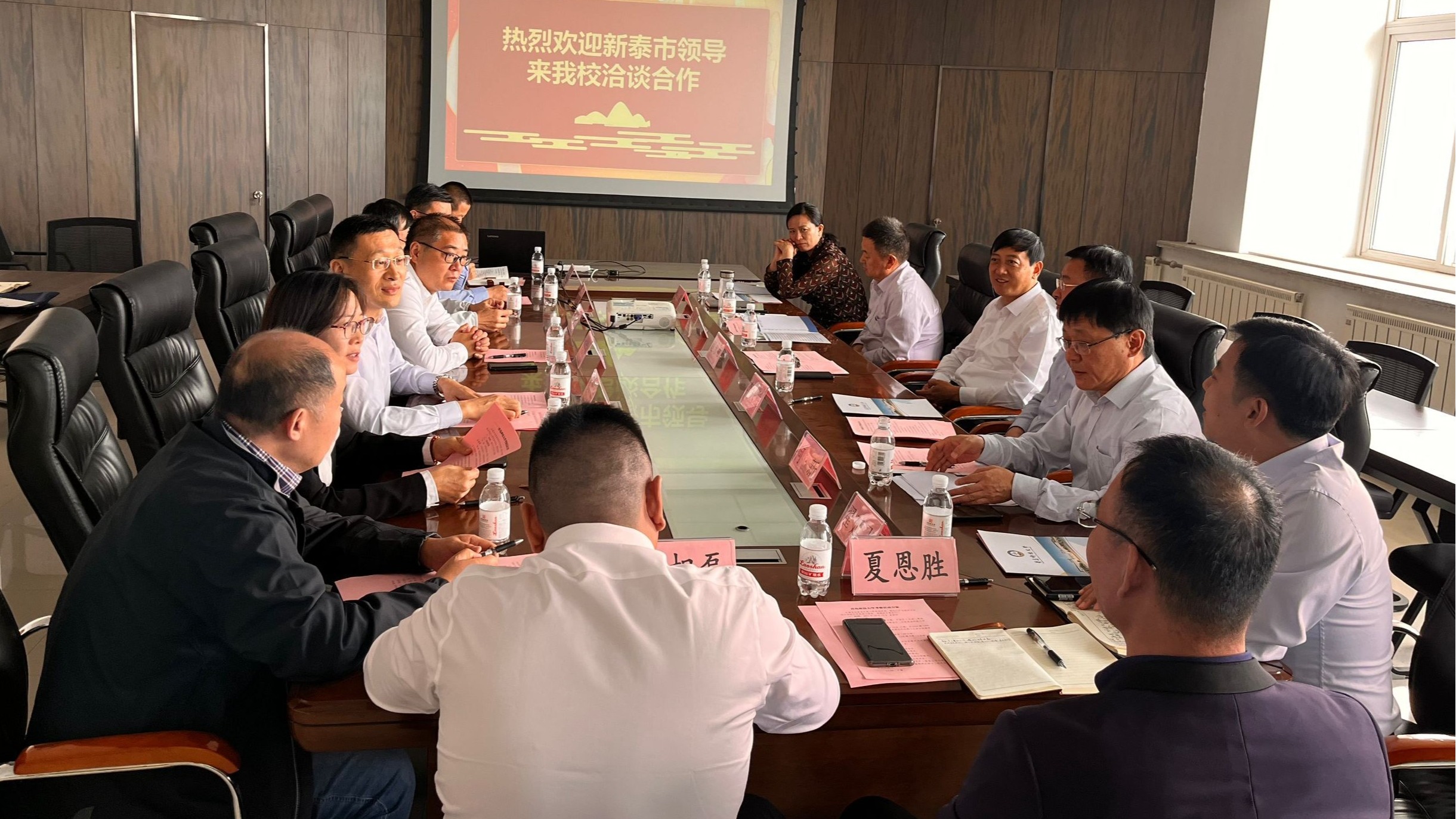 10月12日,新泰市市长赵永斌一行8人莅临BB贝博艾弗森洽谈交流合作事宜,双方在CCE楼1505会议室举行座谈会。新泰市市长赵永斌、新泰市政法委书记李兴胜、新泰经济开发区管理委员会主任王业训、新泰市科技局局长何新、新泰市招商服务中心主任娄霞、新泰市楼德镇镇长翟延飞、山东春华高分子材料有限公司总经理夏恩胜、特变电工鲁缆公司总经理助理任相磊、党委常委、副董事长李志波、科技处副处长胡志强、公司党委书记王德宝、光电传感与生命分析重点实验室执行主任丁彩凤、公司副经理高洪涛、公司党委副书记兼副经理杨小明、经理助理李琛琛参加活动。校务委员、合作发展处处长聂广明主持会议。