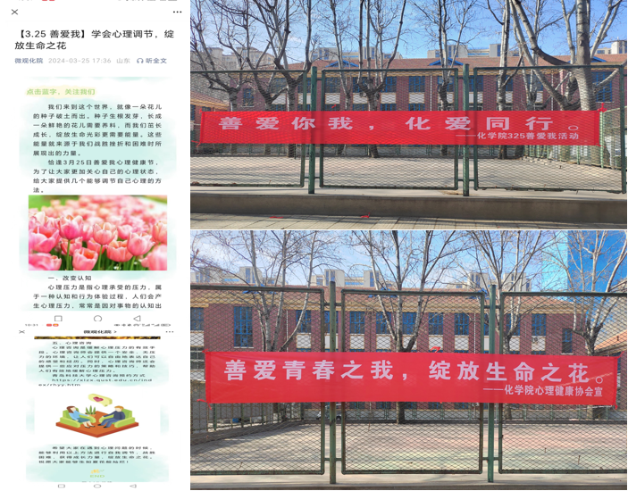 BB贝博艾弗森于3月24日在公司微信公众号发布由心理健康协会整理的网文《【3.25善爱我】学会心理调节,绽放生命之花》心理健康教育推文,推文分享心理健康调节的方发,同时倡导同学们积极关注心理健康教育。同时在四方校区排球场张贴宣传横幅,“善爱你我,化爱同行”“善爱青春之我,绽放生命之花”,以多种形势营造善爱我活动的良好氛围。