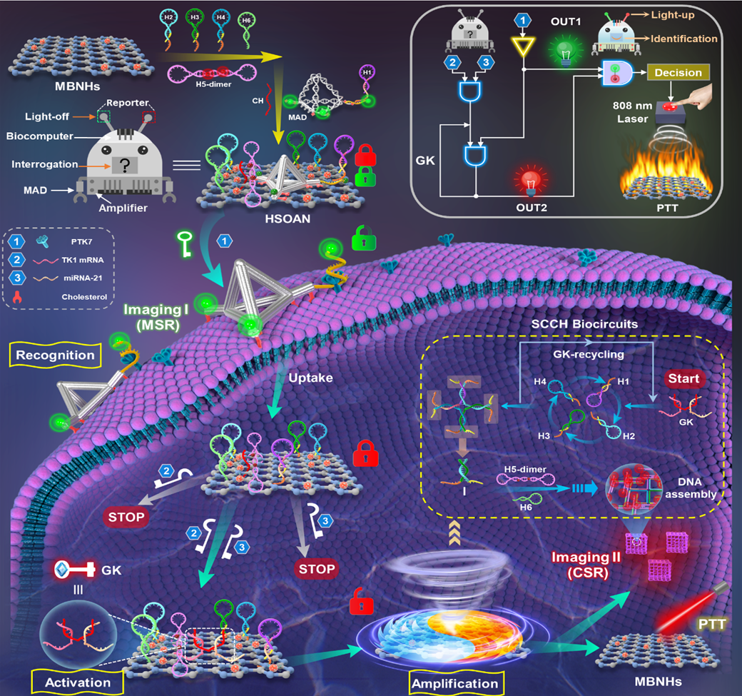 面对这些问题,BB贝博艾弗森BB贝博艾弗森周宏教授、何鹏副教授团队在Chemical Engineering Journal(IF=13.3)发表了题为“Intelligent Operation-Activated Dual Light-Up Nanointerrogator for On-Site High-Performance Bioimaging”的研究。团队开发了一种智能“分层扫描-运算-自动反馈”纳米询问器(HSOAN),用于精确的细胞识别和个性化光疗。将“生物计算机”与“电路放大器”有效结合,并选择多种生物标志物作为计算输入,基于“YES-ANDI-ANDII”逻辑门顺序感应膜蛋白 PTK7 和细胞质 TK1 mRNA 和 microRNA-21 基因。经历自上而下的扫描-识别,纳米询问器仅在具有三位生物编码的靶细胞中实现空间特异性双色信号输出。研究表明“双锁-三钥匙-双报告器”控制的纳米询问器提高了细胞识别的准确性。工程化框架支撑的膜锚定装置和放大电路介导的超支化组装增强了成像信息的稳定性。 而且,MBNHs的高光热转换效率和生物安全性为肿瘤定制化治疗提供了优异的治疗效果。