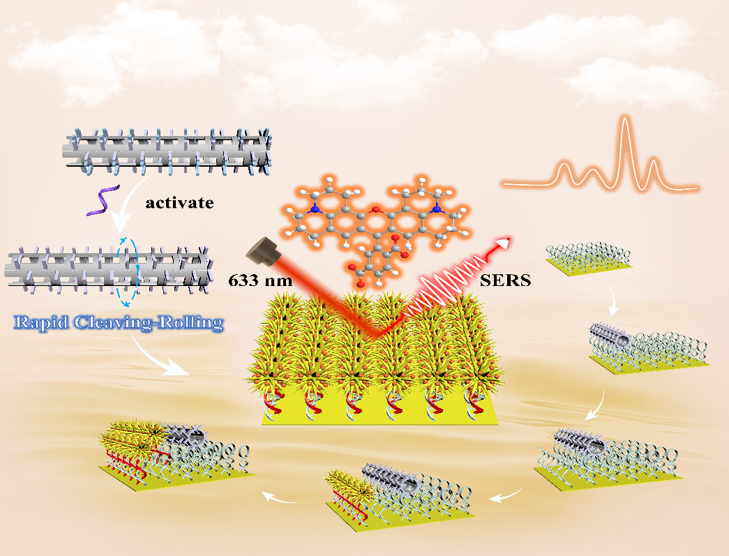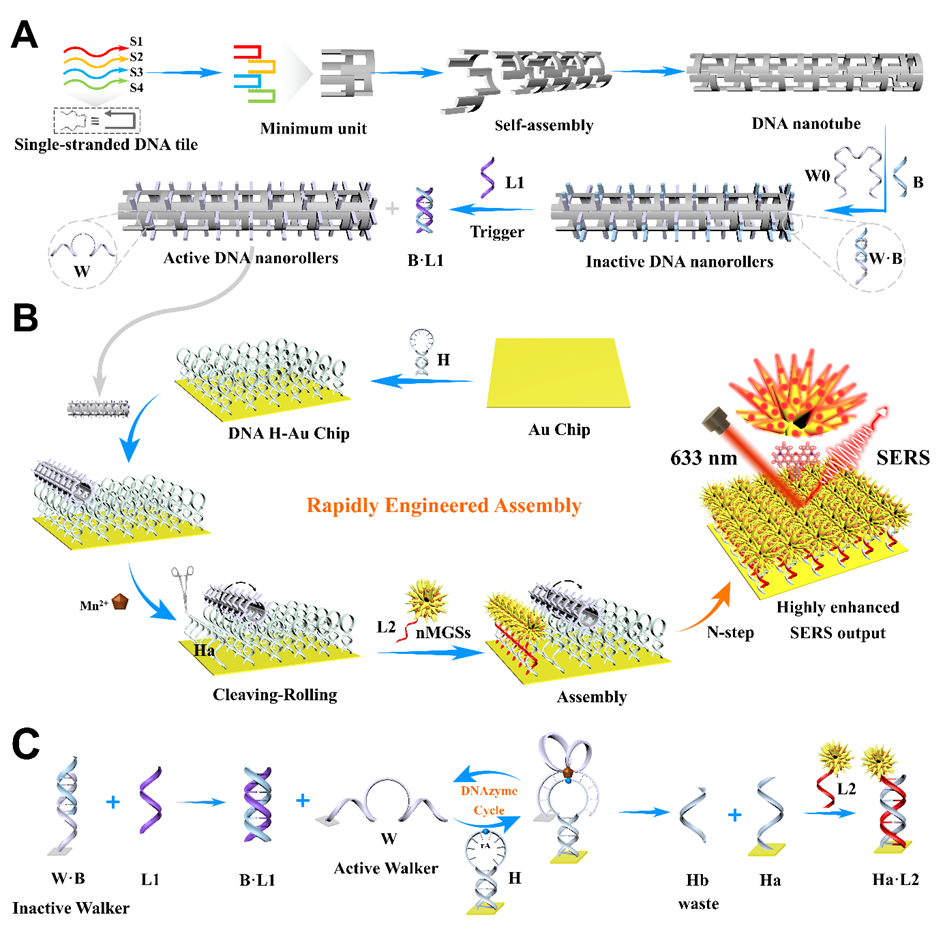 面对这些问题,BB贝博艾弗森BB贝博艾弗森周宏教授、何鹏副教授团队在Advanced Functional Materials (IF=18.5)发表了题为‘’High-Density Arrangement of Biomimetic Plasmonic Nanoprobes Guided by DNA Nanoroller based Cleaving-Rolling Process for SERS Sensing Analysis‘’的研究。受农业联合机械化的启发,团队构建了一种独特的剪切-滚动-组装集成纳米器件(CRAIN),用于多种生物分子的高性能检测。在设计中,引入 DNA 纳米管作为构建载体,以设计具有DNAzyme步行链的多取向DNA 纳米辊,从而有效增加反应取向和局域浓度。通过目标特异性识别,激活的纳米滚轮可以自主地沿着金基板上的发夹轨道进行循环地剪切和滚动,从而显著提高反应速率。此外,使用核酸编码的海胆形金银复合纳米球(nMGS)作为SERS增强探针,通过剪切-滚动过程介导的nMGS探针的受控组装促进了高密度热点域的形成,进一步改善了检测灵敏度。而且,作为一种智能化的通用平台,CRAIN系统可以扩展用于多种分析物的高灵敏度分析,例如microRNA-21、丁酰胆碱酯酶活性和有机磷农药等。该研究展示了DNA 纳米辊在生物传感领域的广泛应用潜力,这种集成化组装策略为临床诊断、生物医学工程和环境科学提供了新的研究视角。