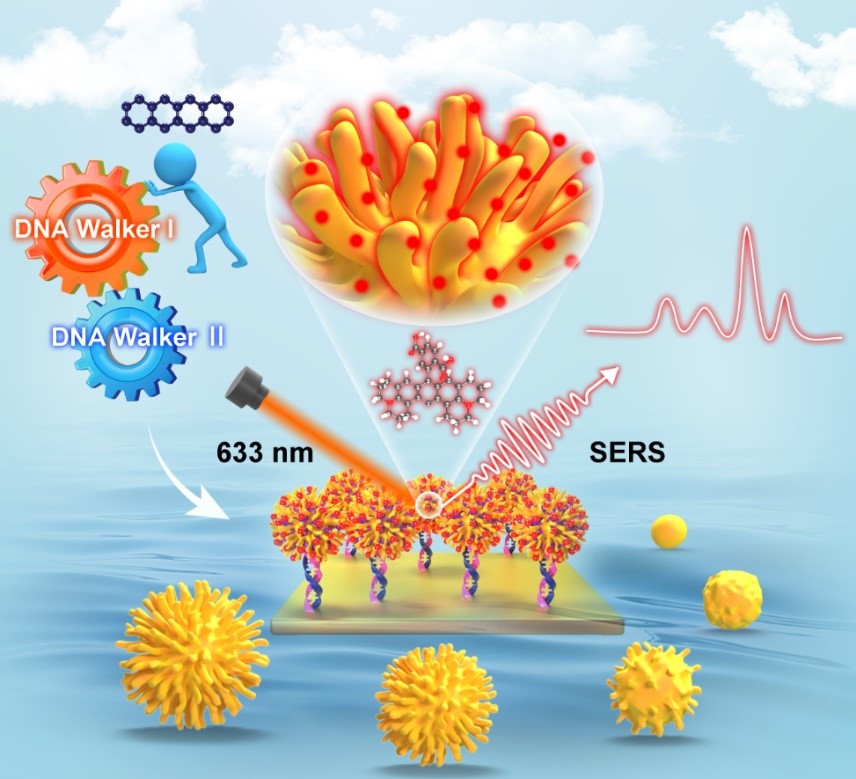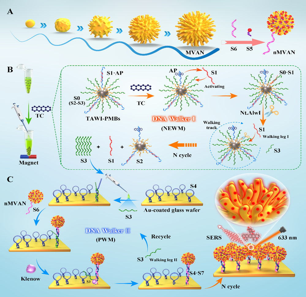 针对以上挑战,BB贝博艾弗森BB贝博艾弗森周宏教授团队、何鹏副教授在Small(IF=13)上发表了题为“Engineering Assembly of Plasmonic Virus-Like Gold SERS Nanoprobe Guided by Intelligent Dual-Machine Nanodevice for High-Performance Analysis of Tetracycline”的研究。该研究设计了一种新型的双机联动纳米器件(DMLD)。以挂锁适配体组件作为启动指挥中心,核酸编码的类病毒多刺突金纳米粒子(nMVANs)作为信号指示器,级联步行者电路作为处理器,实现了对TC的高性能分析。MVAN 中刺突顶点和刺突间纳米间隙的存在促进了强烈的电磁近场聚焦,为nMVAN的高SERS活性提供了保障。而且,通过多级Walker催化电路之间的顺序激活,DLMD系统能够将有限的TC识别转化为DNA扩增子引导的SERS探针的大规模工程化组装,从而实现全域等离子体热点的协同增强。高活性仿生探针和多机模块化设计的精巧结合这一构建理念凸显了智能纳米器件在分析环境和食品中的痕量危害物方面的巨大应用潜力。