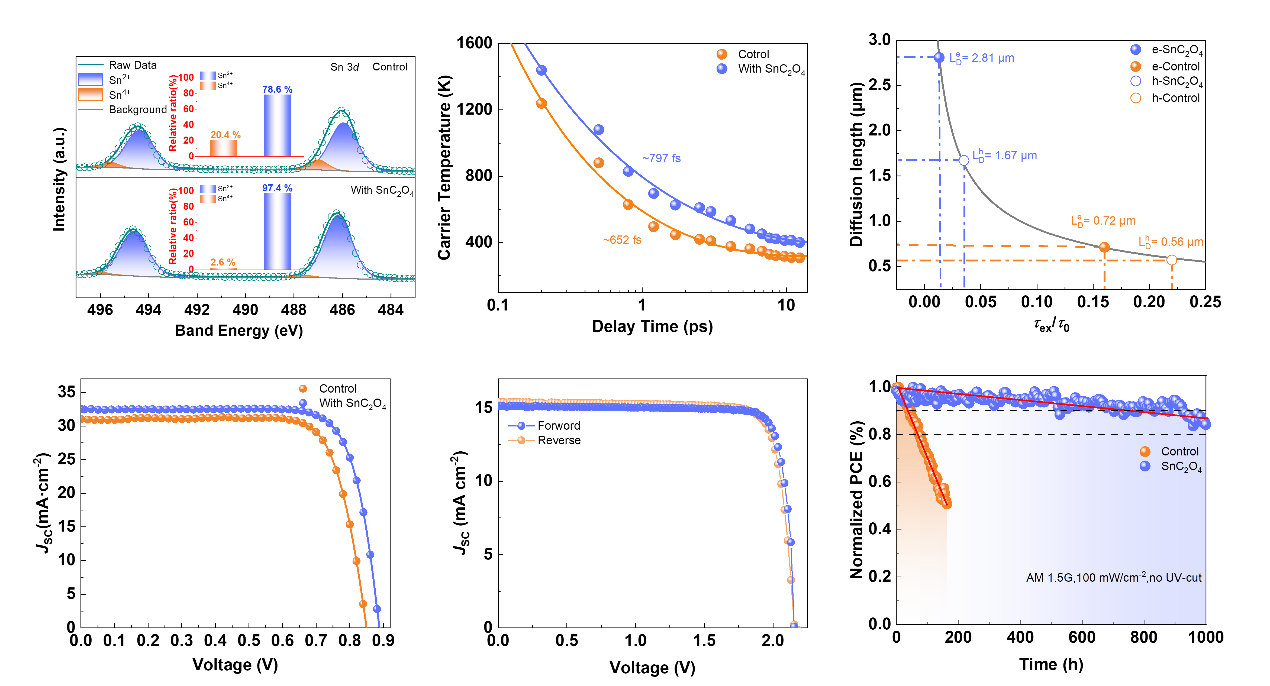 BB贝博艾弗森周忠敏团队与合作者报道了将草酸锡(SnC2O4)引入锡铅钙钛矿前驱体溶液中以调节热载流子冷却动力学。SnC2O4的添加增加了载流子扩散的长度,延长了载流子的寿命,同时减缓了载流子的冷却速度。此外,SnC2O4可以与不配位的Sn2+和Pb2+离子结合,调节钙钛矿的结晶并实现大晶粒。C2O42-的强还原性可以抑制Sn2+氧化成Sn4+,并最大限度地减少所得钙钛矿薄膜中Sn空位的形成。此外,作为氟化锡(II)的替代品,SnC2O4的引入避免了由于F-离子在界面聚集而引起的载流子传输问题。