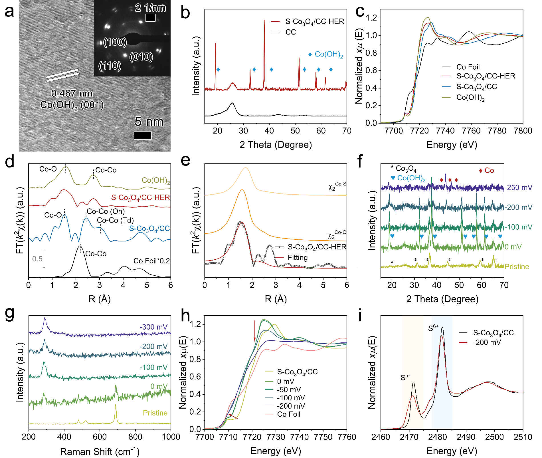 近期,BB贝博艾弗森范开才博士首先通过H2S介导的配位阴离子置换反应,合成了均匀负载在碳布上的S掺杂Co3O4纳米片(S-Co3O4/CC)。然后,通过一系列的原位电化学表征手段以及理论计算,深入研究了电催化剂的电化学原位重构并揭示真实的HER活性中心。测试与表征结果表明:引入的氧缺陷和S配位原子能够快速诱导S-Co3O4/CC的电化学原位重构;HER条件下,S2-会与部分氧化的Co结合(CoSx)并分散在电化学原位重构的金属Co晶体表面。理论计算结果表明:CoSx与金属Co基体之间的原子级界面是主要的HER活性中心,界面处的S和Co原子能够协同加快水解离步骤,从而提升HER性能。该阴离子置换方法还被拓展到NiFe基化合物(S-NiFe/CC)的合成中,电化学重构的S-NiFe/CC表现出优越的电催化全解水性能。该研究为揭示电催化剂的电化学原位重构机制及真实活性中心提供了重要研究思路,为合成高活性、高稳定性的HER电催化剂提供了理论和实验指导。