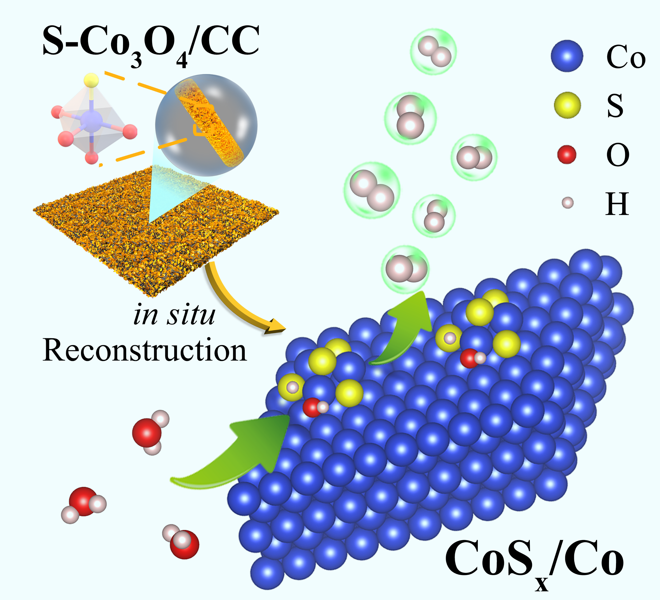 图1、S-Co3O4/CC的电化学原位重构及HER反应机制示意图。