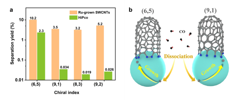 图、(a)单壁碳纳米管的高分离效率和(b)生长动力学示意图。
