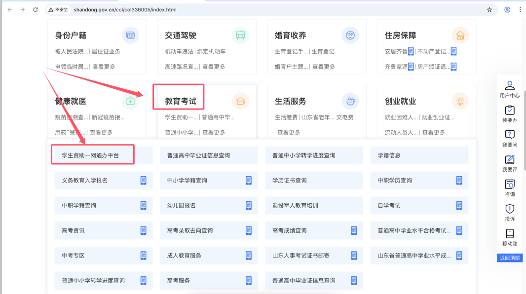 电脑浏览器访问以下地址,在【教育考试】标题下点击【员工资助一网通办平台】,在新页面登录山东省统一身份认证平台,账号密码同爱山东。也可通过短信验证码、支付宝、微信等方式进行登录。