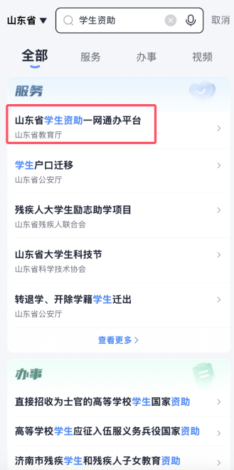 进入爱山东,在搜索栏搜索【员工资助】,点击查询结果中的【山东省员工资助一网通办平台】。