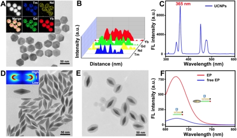 光激活可以决定何时激活而内源性酶激活可以决定在何地激活,这种设计可以确保在亚细胞水平上实现肿瘤细胞特异性分子成像。本实验中将上转换纳米颗粒作为光转换开关确保近红外光的定时激活,修饰有酶响应DNA探针的包覆二氧化硅的金纳米双锥体确保实现肿瘤细胞内特异性激活,并且基于金纳米双锥体的荧光增强能力显著提升检测灵敏度(图2)。