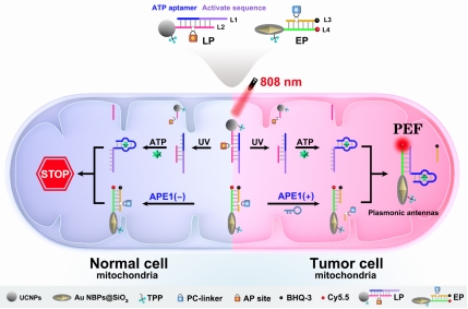 图1近红外光和内源性APE1酶触发的等离子体天线用于亚细胞水平肿瘤细胞特异性分子成像示意图。图片来源:Chem. Sci.
