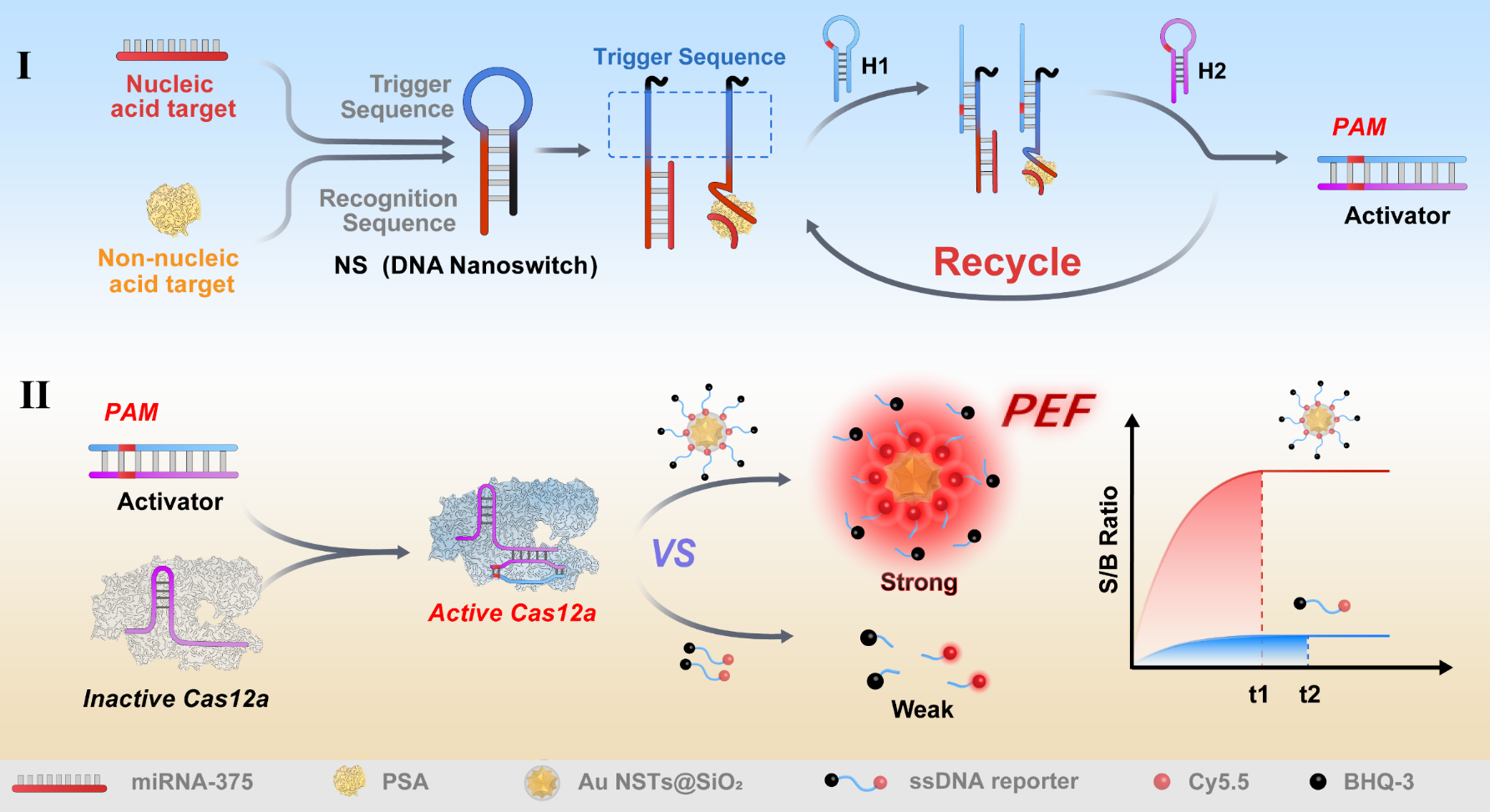 针对上述科学问题,BB贝博艾弗森罗细亮/徐升豪课题组基于前期等离子体激元共振增强荧光(PEF)的高灵敏精准分子检测的工作基础上(Chem. Sci. 2024, 15, 566-572; Anal. Chem. 2024, 96, 16971–16977; Anal. Chem. 2024, 96, 4402-4409; Anal. Chem. 2023, 95, 3525-3531; Anal. Chem. 2022, 94, 5399-5405; Anal. Chem. 2022, 94, 16887-16893; Anal. Chem. 2022, 94, 14467-14474; Anal. Chem. 2021, 93, 2480-2489),开发了一种基于可编程DNA纳米开关(NS)调控的等离子体CRISPR-Cas12a金纳米星(Au-NST)报告平台,并且在空间限制效应的辅助下实现了核酸和非核酸生物标志物的检测(图1)。通过改变NS的识别区域序列,核酸(miRNA-375)和非核酸目标物(PSA)均能打开NS使其暴露出相同的CHA触发序列,经过CHA反应后释放出相同的激活器(双链DNA)并激活Cas12a,实验表明该设计仅需要改变NS的识别区域序列,便可利用一种crRNA实现两种不同类型目标物的检测(图1)。