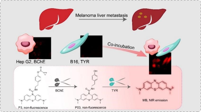 黑素瘤极易发生肝转移,进而导致患者死亡。黑素瘤肝转移的早期诊断可以指导对其及时干预,从而提高治疗效果和患者预后。依此提出了一种由肝细胞中过表达的BChE和黑素瘤标志物TYR协同激活的双靶标荧光探针。探针在BChE和TYR的连续催化水解下,释放近红外荧光染料亚甲基蓝(MB)并发射荧光。随后全面研究了探针与BChE和TYR先后作用的光谱性能,并创造性地建立了肝癌细胞与黑素瘤细胞的共孵育模型进行细胞成像研究,以模拟黑素瘤的早期肝转移。此外,活体层面黑素瘤的转染实验也证实该探针能够应用于原发性黑素瘤肝转移早期诊断和实时荧光示踪。该研究成果以“NIR Fluorescent Strategy for Early Diagnosis of Melanoma Liver Metastasis Based on the Cascade Reaction of Two Specific Bio-enzymes”为题,也发表在Analytical Chemistry上(Anal. Chem., 2025, 97, 3125)。