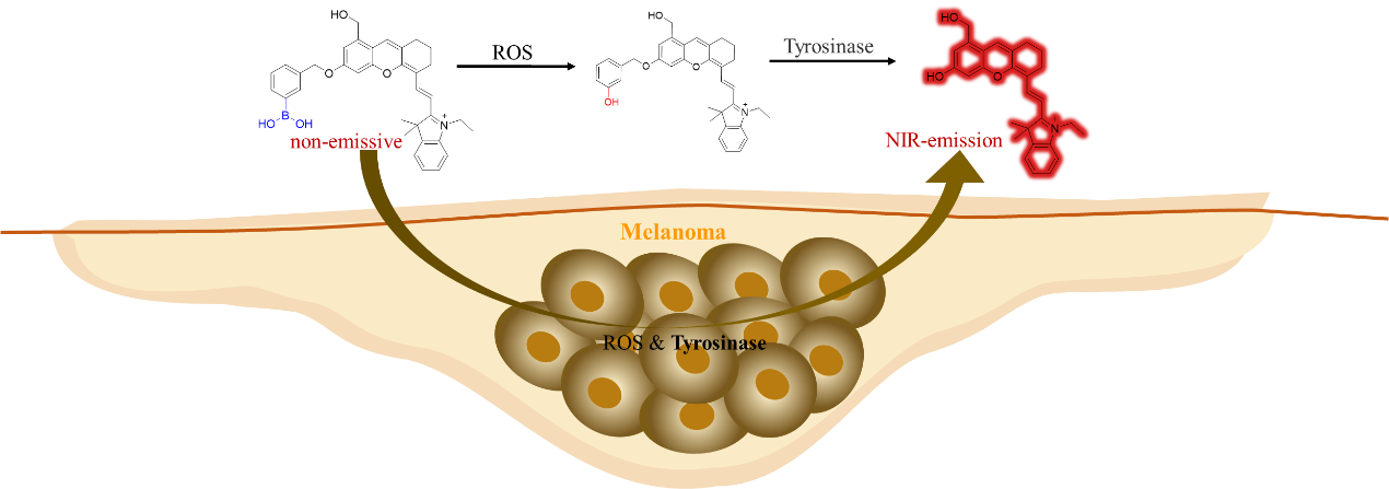 近期,该团队依托多靶标级联激活策略,在肿瘤精准诊断领域再度取得重大突破。酪氨酸酶(TYR)是一种公认的黑素瘤标志物,在肿瘤区域活性氧含量较高,团队依此设计了一系列不同取代位的苯硼酸修饰近红外探针o/m/p-BA-Hcy,筛选出ROS-TYR级联激活的间位取代探针m-BA-Hcy用于黑素瘤的精准早期诊断。探针m-BA-Hcy几乎没有荧光,与邻/对位探针不同的是,m-BA-Hcy单独与H2O2或TYR孵育后不会引起荧光变化。当同时引入H2O2和TYR时,探针m-BA-Hcy的近红外荧光增强。详细的光谱研究证实了探针对ROS-TYR级联反应具有良好的传感性能,随后在细胞、斑马鱼和活体层面的成像研究展示出探针在黑素瘤的早期诊断中具有很好的应用前景。该研究成果以“Reactive Oxygen Species (ROS)–Tyrosinase Cascade-Activated Near-Infrared Fluorescent Probe for the Precise Imaging of Melanoma”为题,发表在分析化学知名期刊Analytical Chemistry上(Anal. Chem., 2025, 97, 4241)。