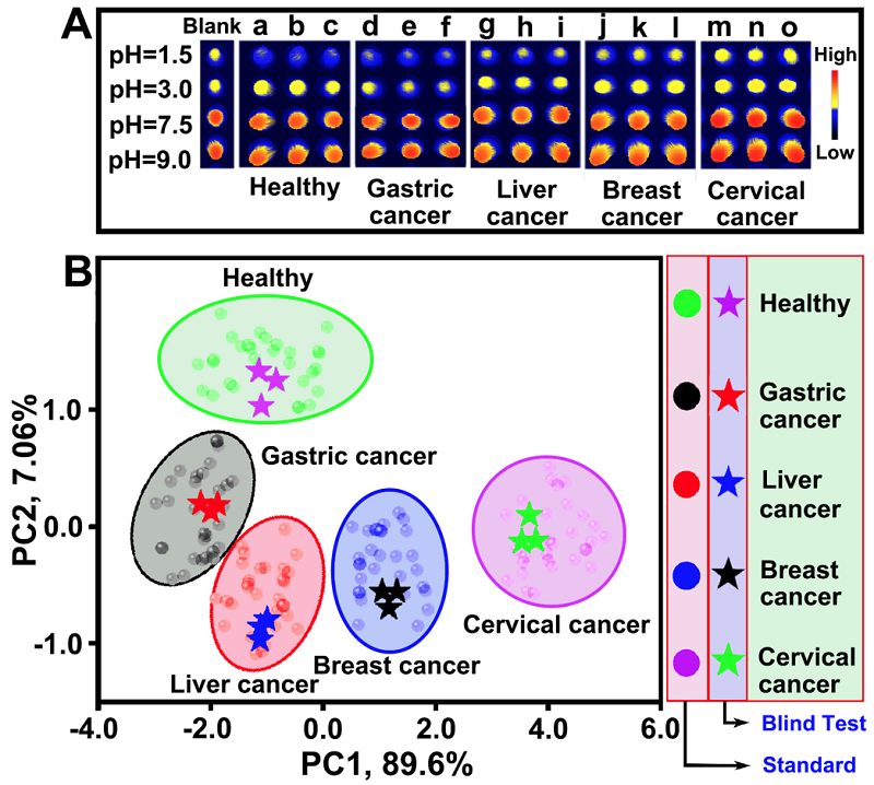 为了解决这一问题,本科三年级丁稼祥、石加衡同学自大二暑假开始进入BB贝博艾弗森徐升豪、罗细亮教授课题组进行科研攻关,开发了一种pH值编程的荧光传感阵列(图1),实现了健康人与胃癌、肝癌、乳腺癌以及直肠癌病人血浆的直接鉴定区分(图2)。同时,15例未知癌症血浆样本也被准确地被鉴定区分,该工作为癌症等重大疾病的早期筛查提供了快速、简便且有效的新方法。