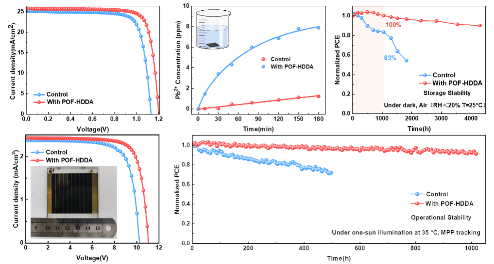 结果表明,聚合物处理器件的冠军PCE达到24.76%,大面积模块(面积为14 cm2)的PCE达到20.66%。-CF2-重复单元使钙钛矿具有疏水性,采用立体方式封装钙钛矿,有效防止铅在水和氧渗透下发生泄漏,铅泄漏抑制率为85%。此外,POF-HDDA修饰的器件还表现出了优秀的存储、湿度稳定性、热稳定性和运行稳定性。在空气中储存4300h后,仍然保留原始效率的90%;在连续光照1000小时后,器件仍保持原始效率的92%,这项工作将有效推动钙钛矿太阳能电池的商业化。