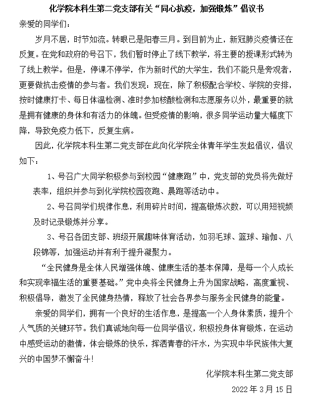 活动开始之前,对在疫情下进行体育锻炼活动的必要性,王德宝书记指出:“在疫情封校期间,我们应该每天抽出一个小时锻炼自己的身体。身体是革命的本钱,‘每天锻炼一小时,健康工作五十年,幸福生活一辈子。’希望大家可以积极参与体育锻炼,保持健康。拥有一个健康的身体,才是人生最大的财富。”