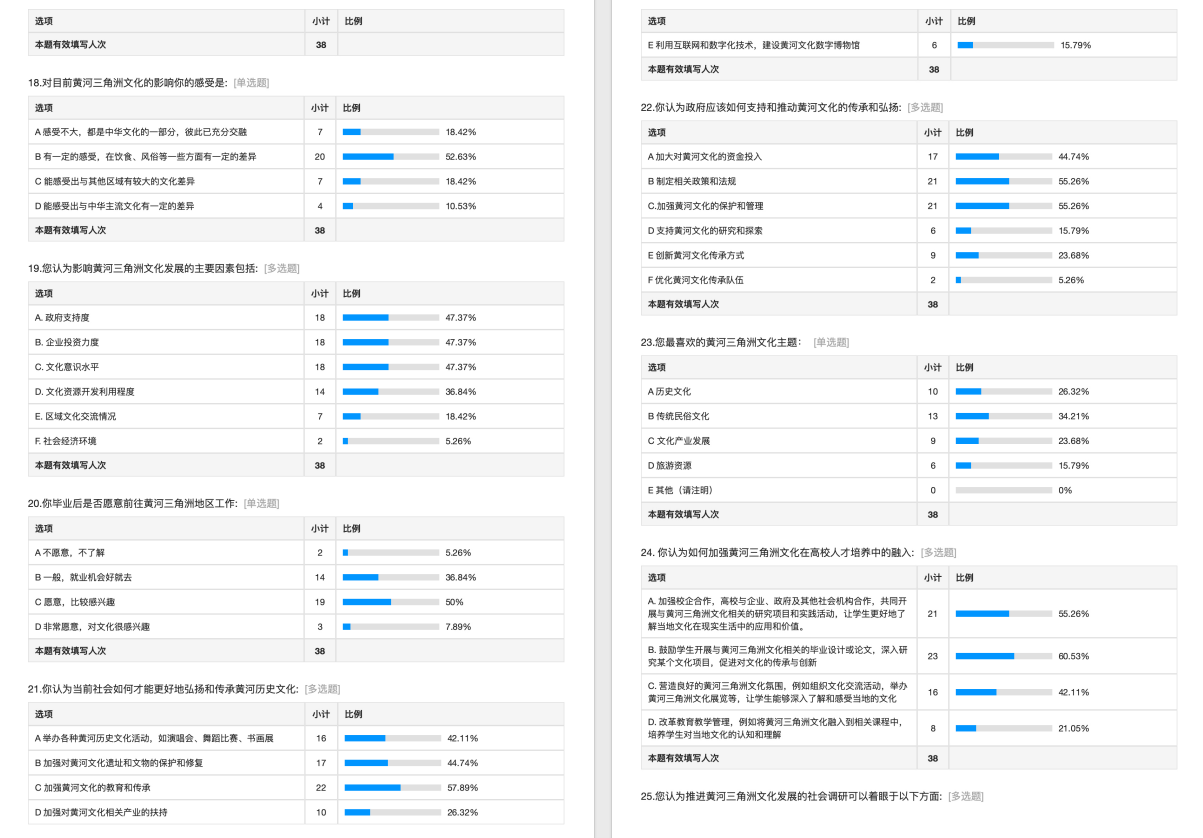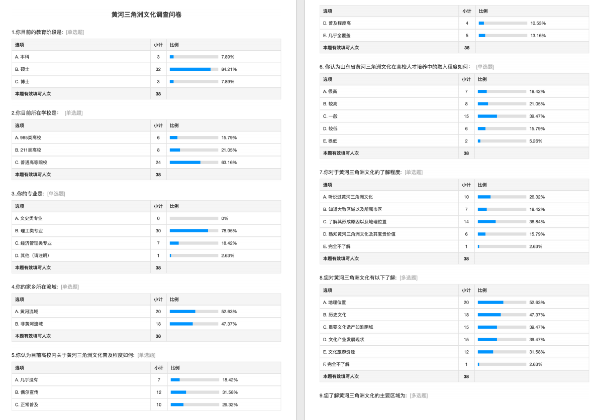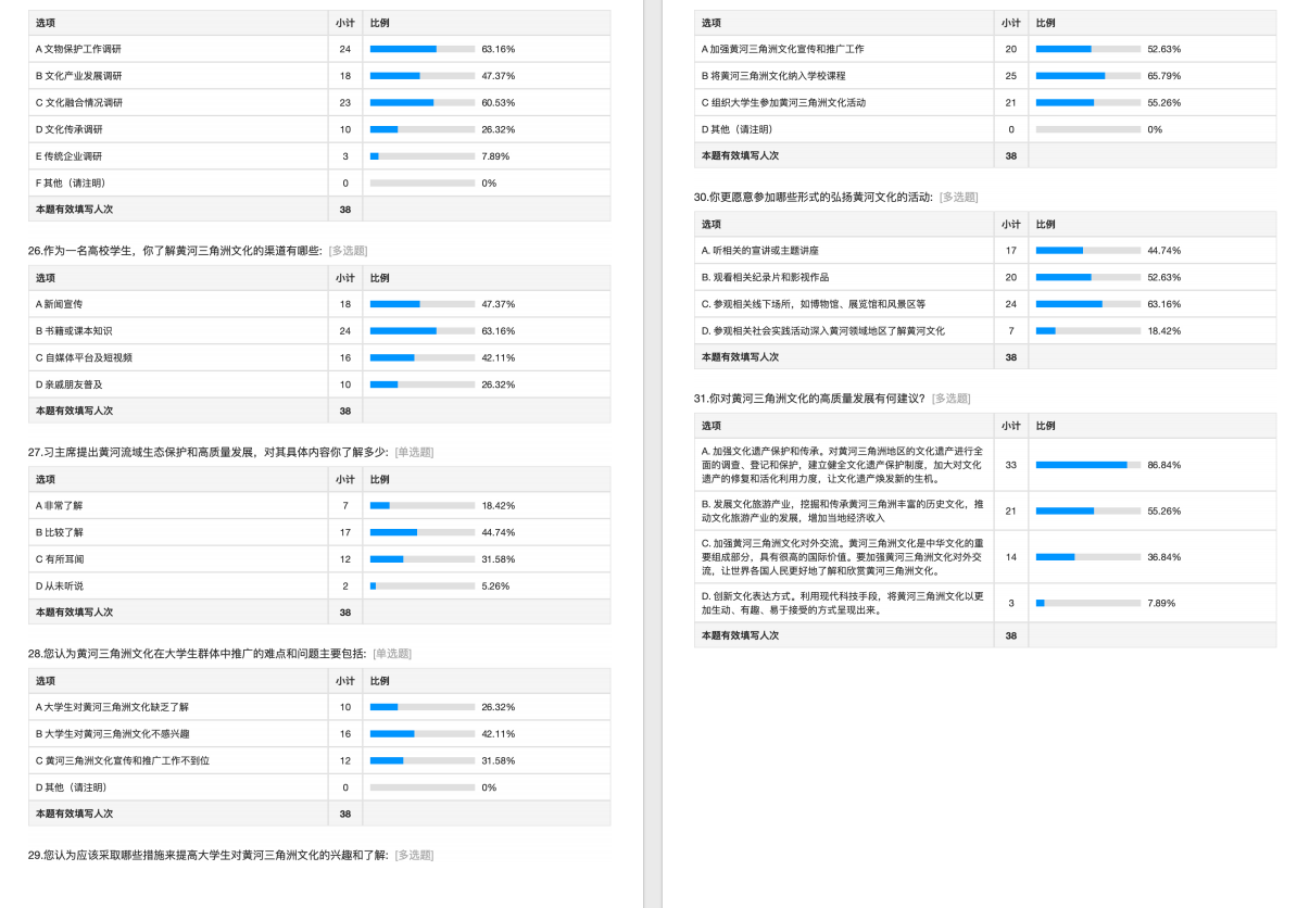 调查结果表明,无论是研究生还是博士生,对于黄河流域文化的了解都相对有限。除此以外,大部分同学认为保护黄河流域的生态环境至关重要,并希望通过加强政府支持、提高公众关注度来更好地保护黄河流域的生态环境。