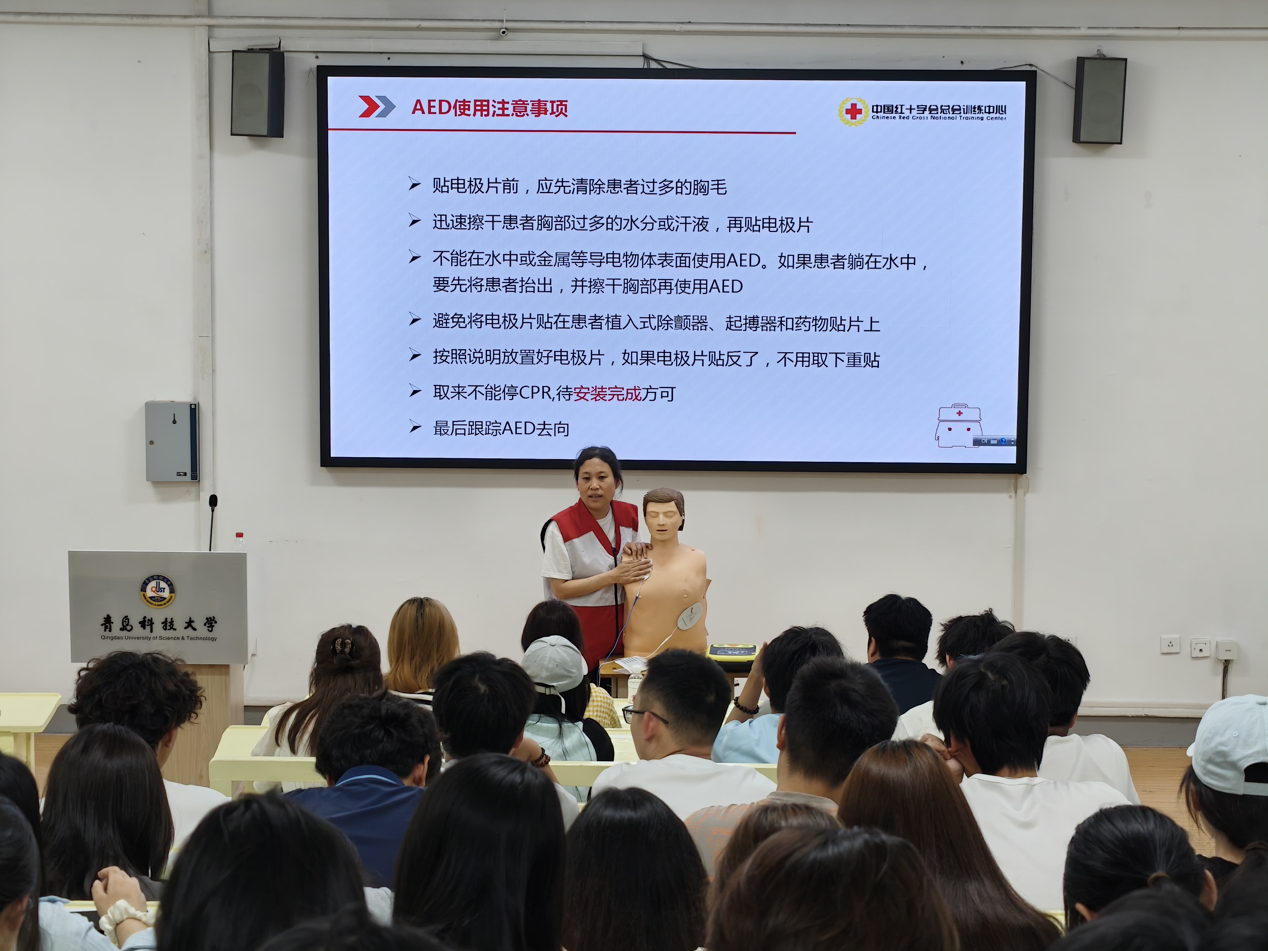 为提升广大师生应急救护能力,普及“黄金四分钟”急救理念,让救命设备AED(自动体外除颤器)真正发挥守护生命的关键作用,6月3日BB贝博艾弗森化学与分子工程学院联合青岛市市北区双山社区邀请青岛市红十字会专业人员,在四方校区一政234举行AED急救培训。