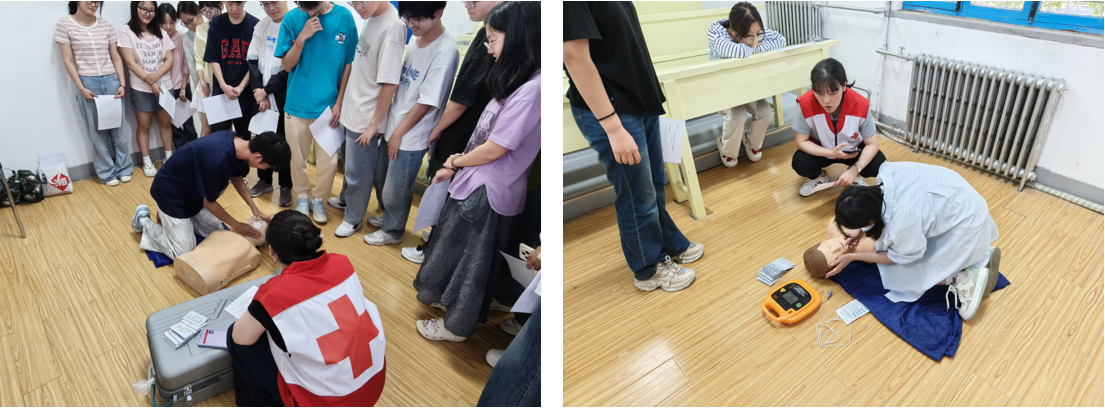 现场展示了AED的构造、工作原理,并逐步演示了清晰的操作步骤:如何开机、如何按语音提示正确粘贴电极片、如何在设备分析心律时确保所有人远离患者、以及何时进行电击除颤。讲解后,参与课程的师生利用模拟假人,分别进行了“单人心肺复苏”的整个急救流程实操练习。在专业导师“手把手”的指导下,大家反复练习胸外按压的力度与节奏,模拟使用AED进行除颤操作,亲身体验了从发现患者到完成初步急救的全过程。