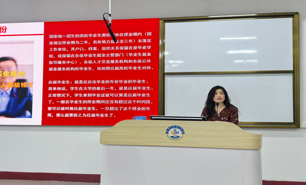 会议伊始,程老师结合往届毕业生就业数据和相关最新政策,深入剖析当前的就业形势,精准指出就业过程中的主要难点,并提出切实可行的建议。她特别强调,同学们应当尽早着手就业准备,科学规划求职目标,充分发挥应届生的独特优势,打破传统就业思维局限,从而实现高质量就业。同时,程老师还表示,公司将持续立足员工需求,整合校内外资源,全心全意为同学们的毕业就业提供支持。